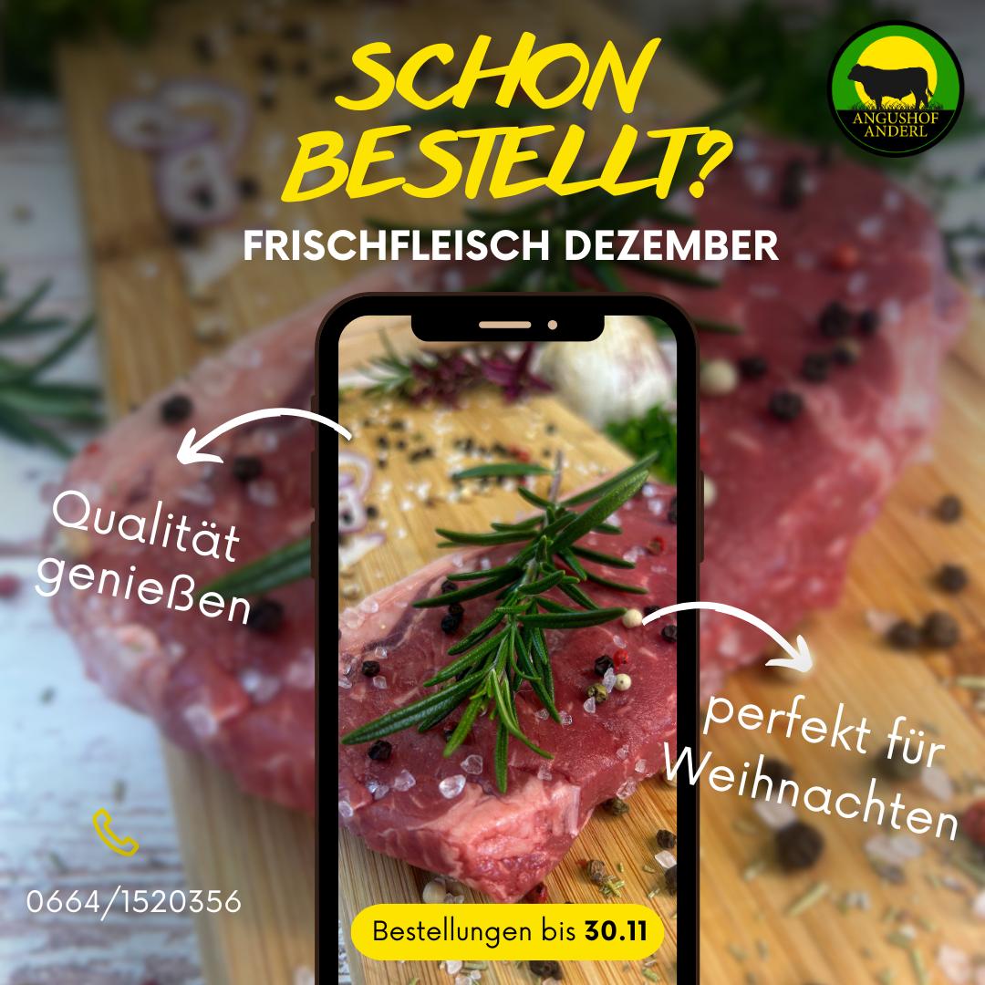 Weihnachten rückt näher – und damit auch die Zeit für richtig gutes Essen! Ab sofort könnt ihr wieder frisches Rindfleisch vom Angusrind vorbestellen. Perfekt für euer festliches Weihnachtsmenü!